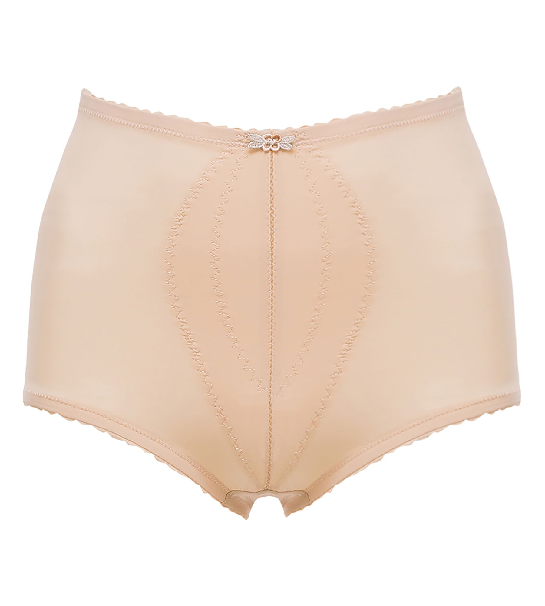 Une culotte taille haute coloris beige de la ligne Incroyable c’est une Gaine ? C’est la culotte qui vient aider la silhouette et lui redonner toute sa beauté. Elle est en microfibre mate et stretch, ultra confortable et parfaitement taillée pour sculpter la silhouette : ventre plat, hanches affinées et une allure divinement féminine… Les coutures irisées dessinent avantageusement la silhouette. Une couture centrale au dos galbe les fesses. Et pour une féminité aboutie, une petite fleur est tissée au centre de la ceinture et un croquet fin prolonge les cuisses et la taille.
